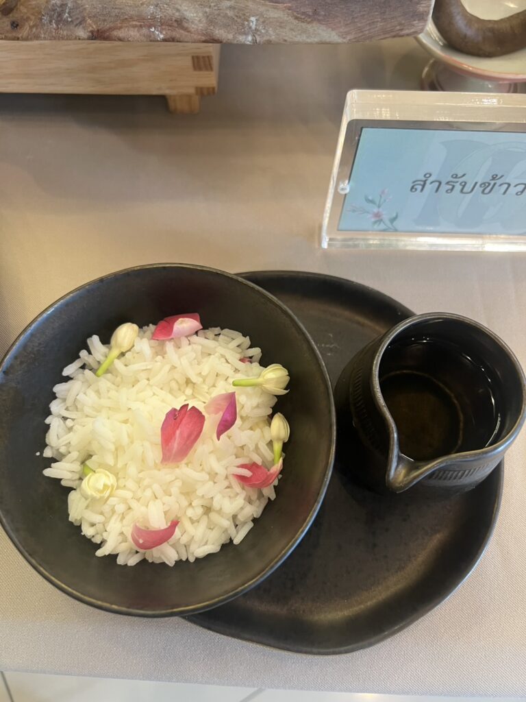 หัวใจสำคัญของเมนูคือ ข้าวแช่ ที่เชฟปิ๊กเลือกใช้ข้าวพันธุ์ “เจ๊กเชย” จากจังหวัดสระบุรี ซึ่งขึ้นชื่อเรื่องความหอมและเม็ดข้าวที่สวยงาม นำมาหุงอย่างพิถีพิถัน ก่อนแช่ใน น้ำแร่จากอำเภอลาดหลุมแก้ว จังหวัดปทุมธานี ที่ผ่านการต้มและพักในโอ่งดินเผา จากนั้นลอยด้วยดอกไม้หอม 4 ชนิด ได้แก่ ชมนาด กระดังงาไทย กุหลาบมอญ และดอกมะลิ ก่อนอบควันเทียนให้เกิดกลิ่นหอมละมุน