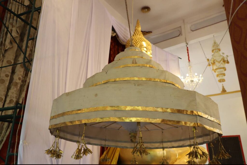 ต่อมาเวลา 16.09 น. ได้ประกอบพิธีอัญเชิญฉัตรผ้าขาว ๕ ชั้น จากทางกั้นเหนือพระพุทธชินวรมุนี (หลวงพ่อเศียร) ลงมา เพื่อดำเนินการบูรณปฏิสังขรณ์ โดยพระสงฆ์เจริญชัยมงคลคาถา ก่อนประกอบพิธีอนุโมทนา กรวดน้ำ รับพร และเสร็จสิ้นพิธี
