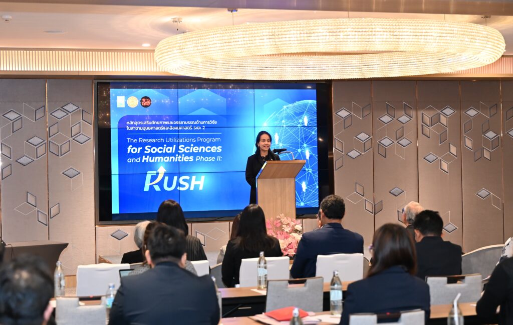 รองศาสตราจารย์ ดร.สุนิดา อรุณพิพัฒน์ จากคณะรัฐศาสตร์ มหาวิทยาลัยธรรมศาสตร์ ในฐานะหัวหน้าโครงการฯ ได้กล่าวถึงวัตถุประสงค์ของการอบรมหลักสูตร RUSH ว่า “โครงการนี้ถือเป็นความริเริ่มอันดีของ วช. ที่ต้องการเห็นบุคลากรในสาขามนุษยศาสตร์และสังคมศาสตร์มีเครือข่ายที่เข้มแข็งและได้รับการเสริมศักยภาพอย่างต่อเนื่อง ซึ่งความสำเร็จนี้ได้เริ่มต้นขึ้นตั้งแต่ปีแรก สำหรับในระยะที่ 2 เราได้ยกระดับการดำเนินงานให้เข้มข้นยิ่งขึ้น โดยมุ่งเป้าไปที่การนำงานวิจัยไปใช้ประโยชน์ได้จริง ท้ายที่สุดนี้ จากความสำเร็จในระยะแรกที่นักวิจัยสามารถยื่นขอรับทุนสนับสนุนในลักษณะงานวิจัยเพื่อการนำไปใช้ประโยชน์ได้ตามเป้าหมาย ทำให้เรามั่นใจว่าเครือข่ายที่เรามุ่งมั่นสร้างสรรค์ขึ้นในปีนี้ ซึ่งเต็มไปด้วยความพยายาม ความหวัง และความห่วงใย จะนำพาทุกท่านไปสู่การนำงานวิจัยไปใช้ประโยชน์ได้อย่างแท้จริง ตลอดจนร่วมกันยกระดับการพัฒนาประเทศไปสู่อีกขั้นหนึ่ง”