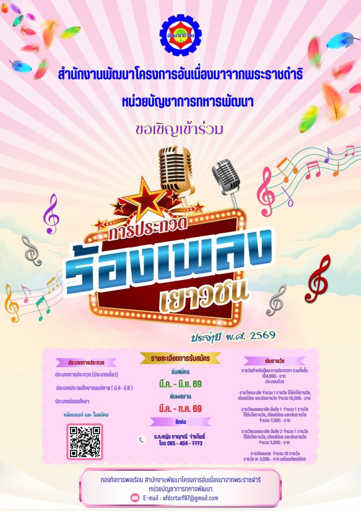 เมื่อวันที่ 20 มีนาคม 2569 สำนักงานพัฒนาโครงการอันเนื่องมาจากพระราชดำริ (สนร.) หน่วยบัญชาการทหารพัฒนา (นทพ.) จ.ปทุมธานี ขอเชิญชวนนักเรียนระดับประถมศึกษาและมัธยมศึกษาตอนต้นทั่วประเทศ ร่วมแสดงพลังแห่งความจงรักภักดีและโชว์ศักยภาพทางดนตรีใน “โครงการประกวดร้องเพลงเยาวชน ประจำปีงบประมาณ พ.ศ. 2569”
