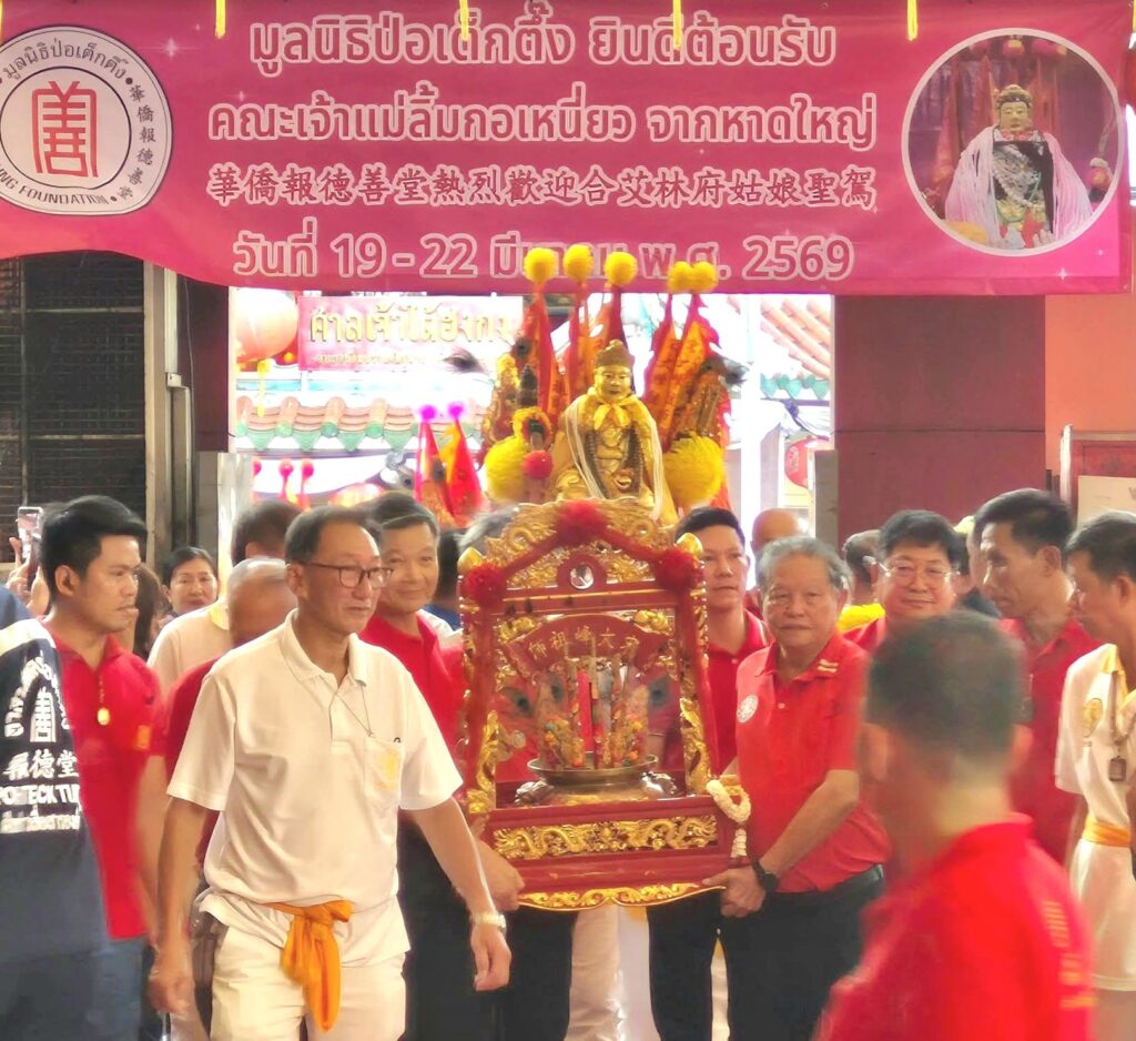 วานนี้ (วันพฤหัสบดีที่ 19 มีนาคม พ.ศ. 2569) มูลนิธิป่อเต็กตึ๊ง นำโดย นายวิชิต ชินวงศ์วรกุล รองประธานกรรมการ นายวิรุฬ เตชะไพบูลย์ ที่ปรึกษาประธานกรรมการ นายสุรพงษ์ เตชะหรูวิจิตร กรรมการและรองเลขาธิการ พร้อมด้วย คณะกรรมการ ผู้ช่วยกรรมการ และผู้บริหารมูลนิธิฯ จัดพิธีต้อนรับและอัญเชิญเจ้าแม่ลิ้มกอเหนี่ยว องค์ฮกเต็กแป๊ะกง องค์นาจาไท้จื้อ (เทพโกมินทร์) และองค์หลวงปู่ไต้ฮง จาก มูลนิธิมิตรภาพสามัคคี (ท่งเซียเซี่ยงตึ๊ง) หาดใหญ่ เข้าประดิษฐาน ณ บริเวณลานสำนักงานมูลนิธิป่อเต็กตึ๊ง พลับพลาไชย กรุงเทพฯ โดยมี นายอรุณชัย ศิริมหาชัย ประธานมูลนิธิมิตรภาพสามัคคี (ท่งเซียเซี่ยงตึ๊ง) หาดใหญ่ พร้อมด้วย คณะกรรมการ เป็นผู้นำคณะและอัญเชิญมายังมูลนิธิป่อเต็กตึ๊ง พลับพลาไชย พร้อมด้วยสาธุชนร่วมพิธีรับคณะเจ้าแม่ลิ้มกอเหนี่ยวกันอย่างเนืองแน่น