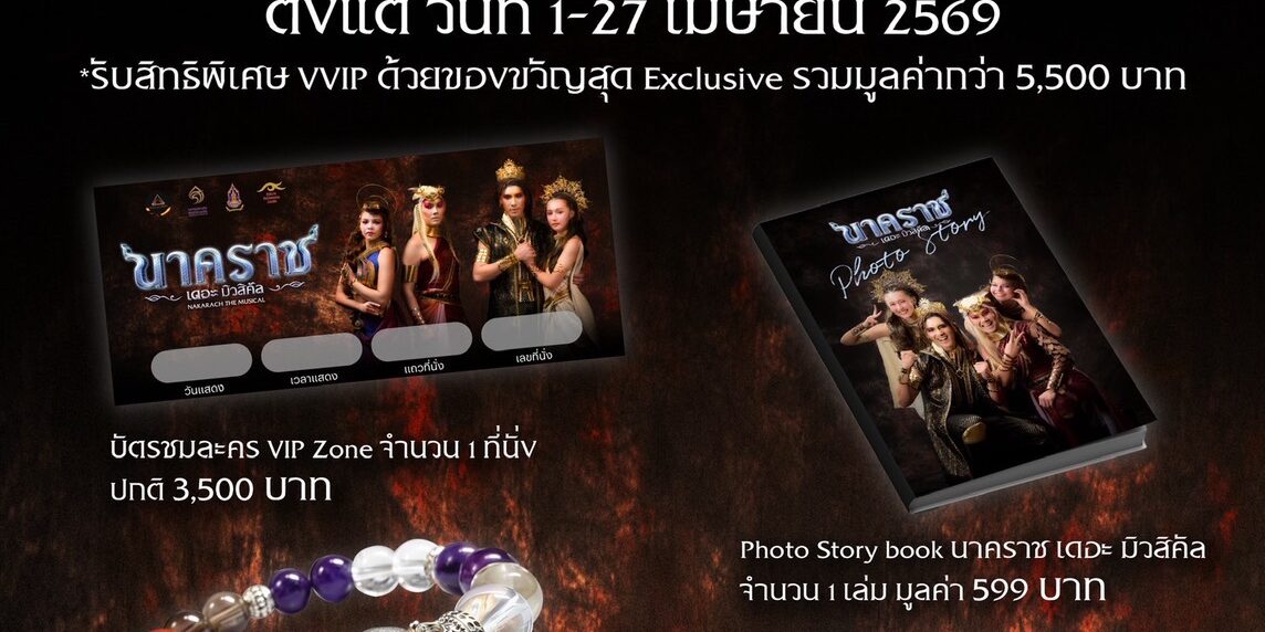 “นาคราช เดอะมิวสิคัล” พร้อมเปิดจำหน่ายบัตร!! Early Bird Promotion สำหรับแฟนละครเวทีตัวจริง !! กับโอกาสสุดพิเศษที่ไม่ควรพลาด!! เริ่ม 1 เมษายน นี้ Early Bird เปิดสิทธิ์จำนวนจำกัด *รับสิทธิพิเศษ VVIP กับของขวัญสุด Exclusive รวมมูลค่ากว่า 5,500บาท