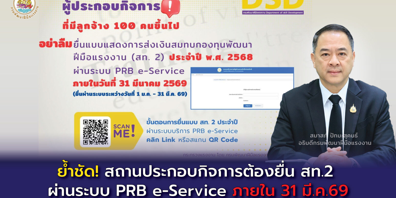 กรมพัฒนาฝีมือแรงงาน เตือนสถานประกอบกิจการ (100 คนขึ้นไป) ต้องยื่นแบบแสดงการส่งเงินสมทบกองทุนพัฒนาฝีมือแรงงาน ประจำปี 2568 ผ่านระบบ PRB e-Service ภายในวันที่ 31 มีนาคม 2569 นี้