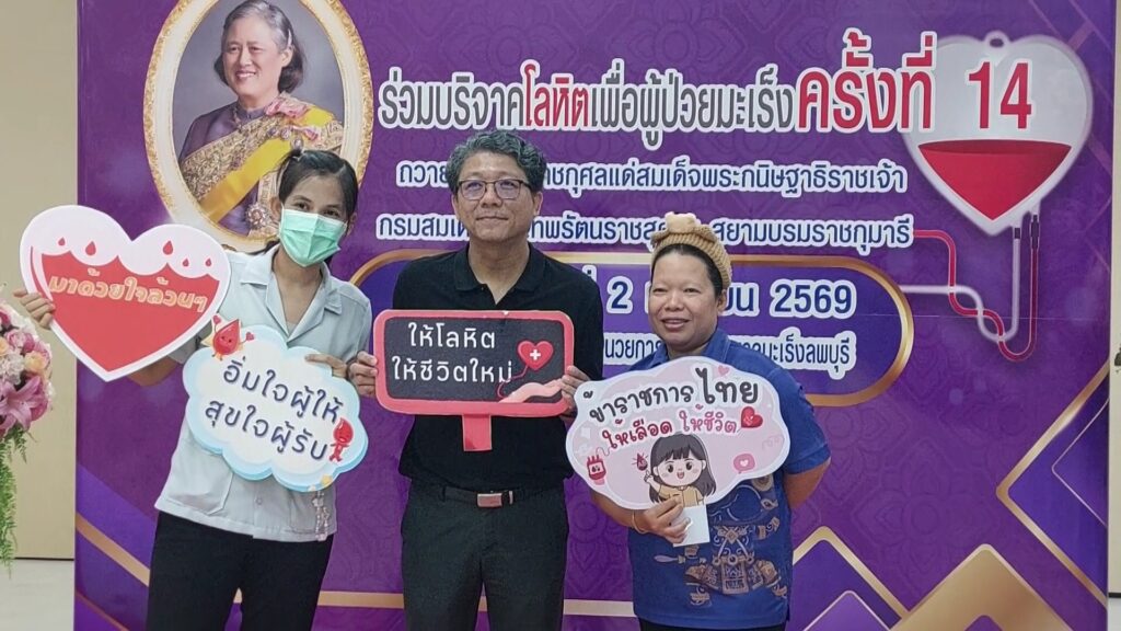 โรงพยาบาลมะเร็งลพบุรี ร่วมกับ สำนักงานภาคบริการโลหิตแห่งชาติที่ 2 จังหวัดลพบุรี จัดกิจกรรมบริจาคโลหิต เพื่อผู้ป่วยมะเร็ง ครั้งที่ 14 เนื่องในโอกาสเดือนมหามงคล เฉลิมพระชนมพรรษา 71 พรรษา เฉลิมพระเกียรติ และถวายเป็นพระราชกุศลแด่ สมเด็จพระกนิษฐาธิราชเจ้า กรมสมเด็จพระเทพรัตนราชสุดาฯ สยามบรมราชกุมารี ณ ห้องประชุมชั้น 6 อาคารอำนวยการ โรงพยาบาลมะเร็งลพบุรี โดยมีข้าราชการ พนักงานราชการ และบุคลากรทางการแพทย์ ของโรงพยาบาล และประชาชน มาลงทะเบียนร่วมบริจาคโลหิตกันอย่างต่อเนื่อง โดยมีทีมแพทย์จากภาคบริการโลหิตแห่งชาติที่ 2 จังหวัดลพบุรี มาให้บริการและอำนวยความสะดวกให้กับผู้ที่มาบริจาคโลหิตเพื่อสำรองโลหิตให้กับผู้ป่วยมะเร็ง ที่จำเป็นต้องได้รับโลหิตในการรักษา