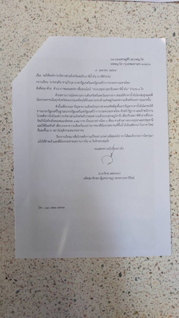 9 เมษายน 2569 นายวัชระ เพชรทอง อดีตสส.พรรคประชาธิปัตย์ เปิดเผยว่า ได้ทำหนังสือถึง อนุทิน ชาญวีรกูล เพื่อขอให้เร่งพิจารณาสั่งการไปยังองค์การบริหารส่วนจังหวัด (อบจ.) ทั่วประเทศ งดจัดเก็บภาษีน้ำมัน หรือภาษีหัวจ่าย เป็นการชั่วคราวอย่างน้อย 6 เดือน เพื่อช่วยบรรเทาความเดือดร้อนของประชาชนจากราคาน้ำมันที่พุ่งสูง โดย วัชระ เพชรทอง ระบุว่า สถานการณ์ความตึงเครียดในตะวันออกกลาง ส่งผลให้ราคาน้ำมันในตลาดโลกปรับตัวสูงขึ้นอย่างต่อเนื่อง กระทบต่อค่าครองชีพของประชาชนในทุกพื้นที่ ทำให้ประชาชนต้องแบกรับภาระค่าใช้จ่ายที่เพิ่มขึ้นอย่างหลีกเลี่ยงไม่ได้ ทั้งนี้ ได้เสนอให้รัฐบาลในฐานะผู้กำกับดูแลองค์กรปกครองส่วนท้องถิ่น สั่งการให้ อบจ.ทั่วประเทศ รวมถึง อบจ.สุราษฎร์ธานี พิจารณาปรับลดภาษีหัวจ่ายน้ำมันจากอัตราลิตรละ 4.54 บาท โดยอ้างอิงแนวทางจาก อบจ.พระนครศรีอยุธยา และ อบจ.ปทุมธานี ที่ได้มีการดำเนินมาตรการลดภาษีในลักษณะดังกล่าวแล้ว เจ้าตัวย้ำว่า มาตรการนี้จะช่วยลดภาระค่าครองชีพให้กับประชาชน โดยเฉพาะผู้ที่ต้องซื้อน้ำมันในช่วงที่ราคาปรับตัวสูงขึ้น ซึ่งอาจเกิดความไม่เป็นธรรมจากการจำหน่ายน้ำมันสต็อกเก่าในราคาที่สูงขึ้นตามตลาด อย่างไรก็ตาม วัชระ เพชรทอง ยังได้ขอให้ อนุทิน ชาญวีรกูล เร่งพิจารณาสั่งการให้มีผลโดยเร็ว และแจ้งผลการดำเนินการภายใน 7 วัน เพื่อให้ประชาชนได้รับทราบความคืบหน้าอย่างเป็นรูปธรรม ทั้งนี้ ข้อเสนอดังกล่าวถูกมองว่าเป็นอีกหนึ่งแนวทางในการบรรเทาผลกระทบทางเศรษฐกิจให้กับประชาชน ท่ามกลางสถานการณ์ราคาพลังงานโลกที่ยังคงผันผวนต่อเนื่องในปัจจุบัน