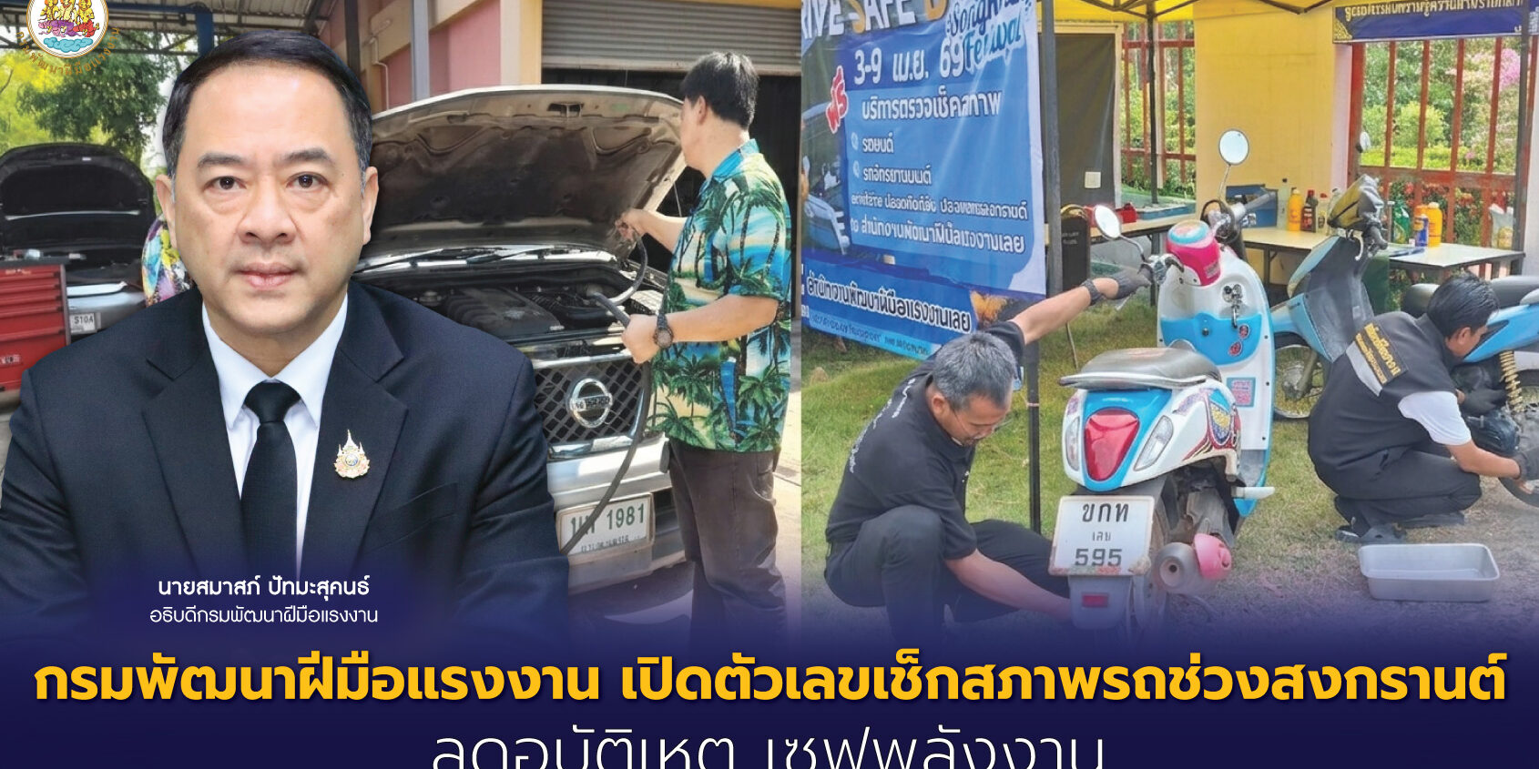 นายสมาสภ์ ปัทมะสุคนธ์ อธิบดีกรมพัฒนาฝีมือแรงงาน เปิดเผยว่า ในช่วงระหว่างวันที่ 3-9 เมษายน 2569 ที่ผ่านมา กรมพัฒนาฝีมือแรงงาน เปิดบริการตรวจเช็กสภาพรถยนต์และมอเตอร์ไซค์ฟรีในช่วงก่อนเทศกาลสงกรานต์ทั่วประเทศ เพื่อป้องกันและลดอุบัติเหตุทางถนนช่วงเวลาดังกล่าว ซึ่งดำเนินการบริการตรวจเช็กสภาพโดยเจ้าหน้าที่และผู้เข้ารับการฝึกอบรมของสถาบันพัฒนาฝีมือแรงงานและสำนักงานพัฒนาฝีมือแรงงาน โดยได้รับความสนใจจากประชาชนและแรงงานนำรถยนต์และมอเตอร์ไซค์เข้ารับบริการถึง 2,822 คัน ประกอบด้วย รถยนต์ 723 คัน และรถจักรยานยนต์ 2,099 คัน จังหวัดที่มีผู้ใช้บริการเป็นจำนวนมาก เช่น กรุงเทพมหานคร,กระบี่,สงขลา,สตูล,ปัตตานี,พะเยา,สมุทรสงคราม,ราชบุรี เป็นต้น ขอขอบคุณทุกหน่วยงานที่ให้บริการทำให้ความปลอดภัยบนท้องถนนมีมากขึ้น และที่สำคัญการตรวจเช็กสภาพรถยังมีส่วนช่วยลดการสูญเสียเชื้อเพลิงพลังงานน้ำมันภายในรถ ในยามวิกฤตขาดแคลนพลังงานที่ประเทศกำลังเผชิญอยู่ในปัจจุบัน