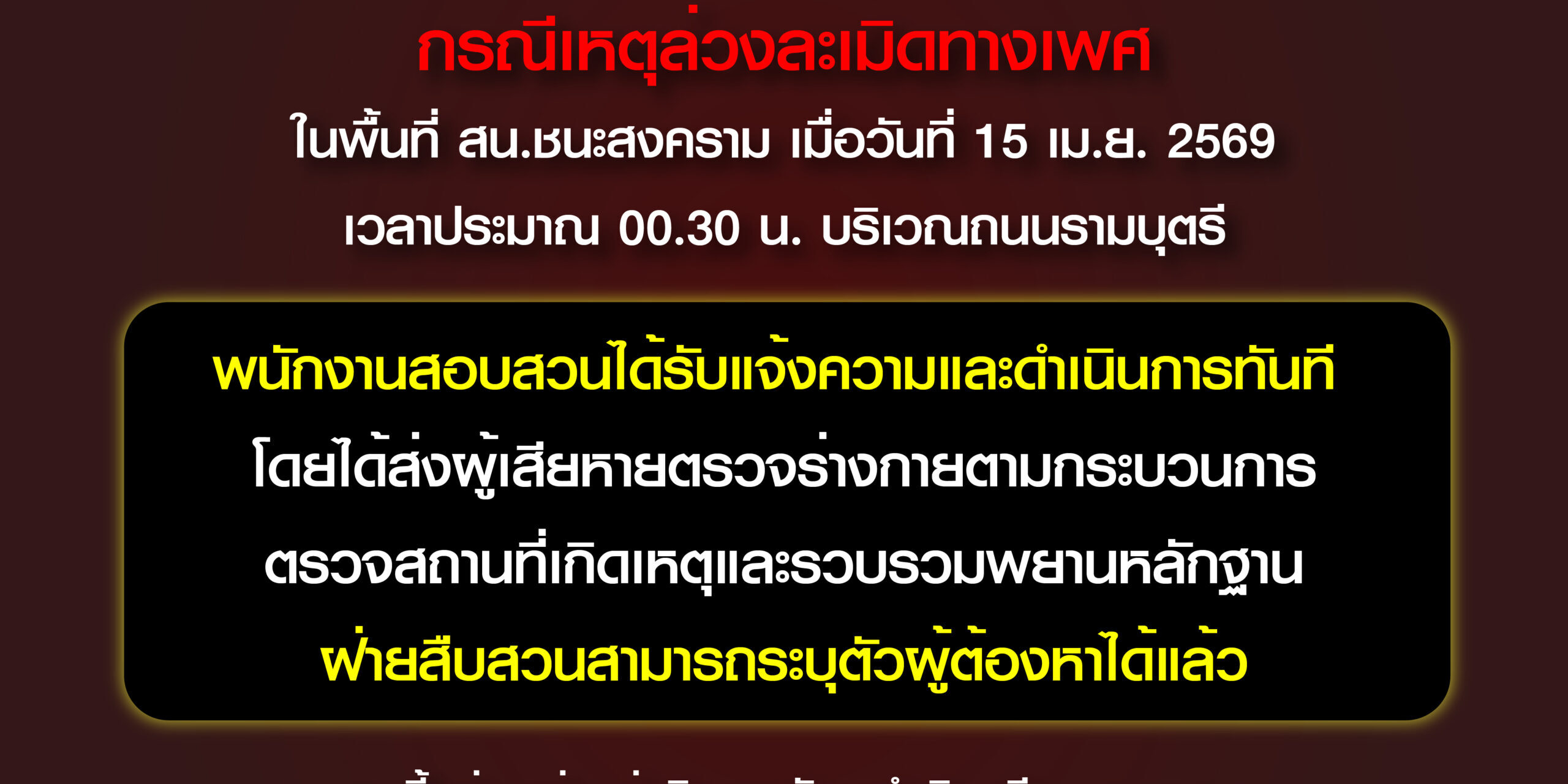 กองบัญชาการตำรวจนครบาล ขอชี้แจงตามที่ปรากฎข้อมูลในสื่อสังคมออนไลน์ กรณีเหตุล่วงละเมิดทางเพศในพื้นที่ สน.ชนะสงคราม เมื่อวันที่ 15 เมษายน 2569 เวลาประมาณ 00.30 น. บริเวณถนนรามบุตรี พนักงานสอบสวนได้รับแจ้งความและดำเนินการทันที โดยได้ส่งผู้เสียหายตรวจร่างกายตามกระบวนการ ตรวจสถานที่เกิดเหตุและรวบรวมพยานหลักฐาน ฝ่ายสืบสวนสามารถระบุตัวผู้ต้องหาได้แล้ว ขณะนี้อยู่ระหว่างเร่งติดตามตัวมาดำเนินคดีตามกฎหมาย