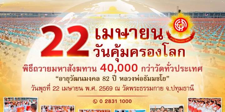 วันที่ 18 เมษายน 2569 พระครูสมุห์สนิทวงศ์ วุฑฺฒิวํโส, ดร. ผู้ช่วยเจ้าอาวาสวัดพระธรรมกาย จ.ปทุมธานี และผู้อำนวยการสำนักสื่อสารองค์กร เปิดเผยว่า วัดพระธรรมกายได้เตรียมความพร้อมจัดงานบุญใหญ่ พิธีถวายมหาสังฆทาน 40,000 กว่าวัดทั่วไทย เนื่องในวันคุ้มครองโลก และวาระอายุวัฒนมงคล 82 ปี หลวงพ่อธัมมชโย ในวันพุธที่ 22 เมษายน 2569 ณ ลานธรรม พระมหาธรรมกายเจดีย์ จ.ปทุมธานี พร้อมเปิดมาตรการอำนวยความสะดวกด้านการจราจร เพื่อลดผลกระทบบนถนนสายหลัก