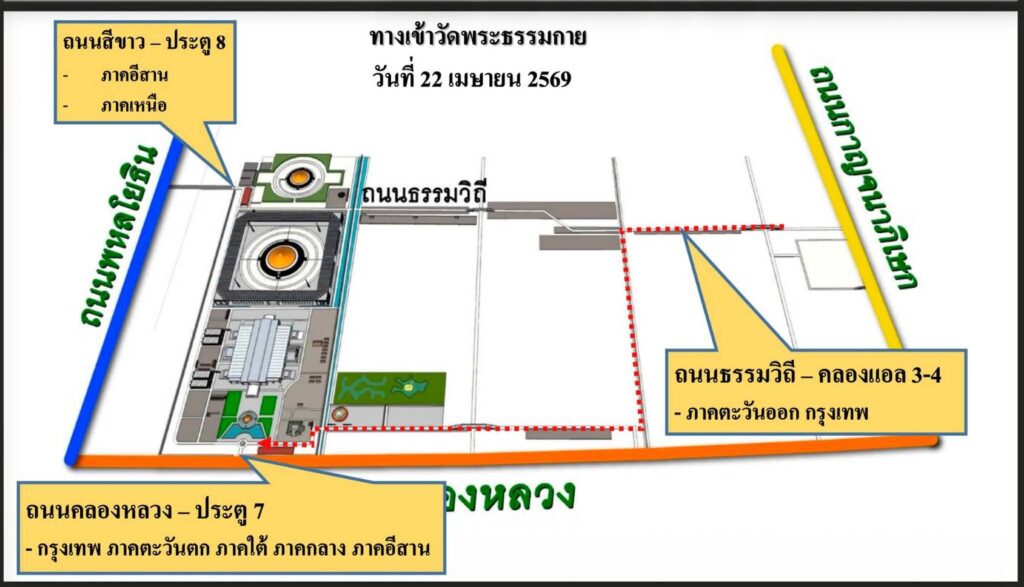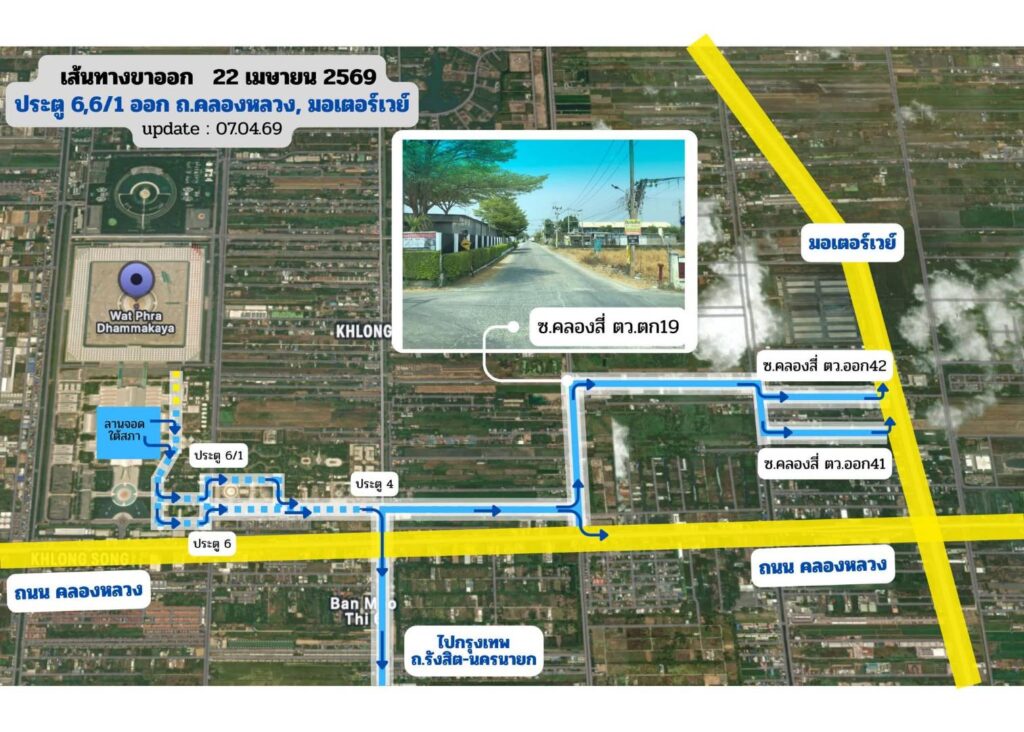 วัดพระธรรมกายได้ประสานความร่วมมือกับเจ้าหน้าที่ตำรวจจราจร และองค์กรปกครองส่วนท้องถิ่นในพื้นที่ พร้อมระดมอาสาสมัครกว่า 1,000 คน ร่วมอำนวยความสะดวกด้านการจราจร จึงขออภัยในความไม่สะดวกต่อประชาชนผู้ใช้รถใช้ถนน โดยคาดว่าการจราจรจะหนาแน่นในช่วงเวลา 08.00 – 15.00 น. และ 17.00 – 20.00 น. และ เพื่อความคล่องตัวในการเดินทาง ประชาชนสามารถใช้เส้นทางลัดในพื้นที่ตำบลคลองสาม ซึ่งเปิดใช้งานเป็นการเฉพาะ และสามารถสอบถามข้อมูลเส้นทางได้ที่ FB “จราจรวัดพระธรรมกาย” และโอเพนแชท “จราจรนิวส์ UPDATE”