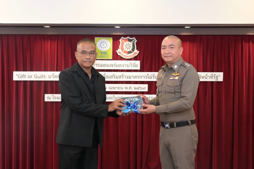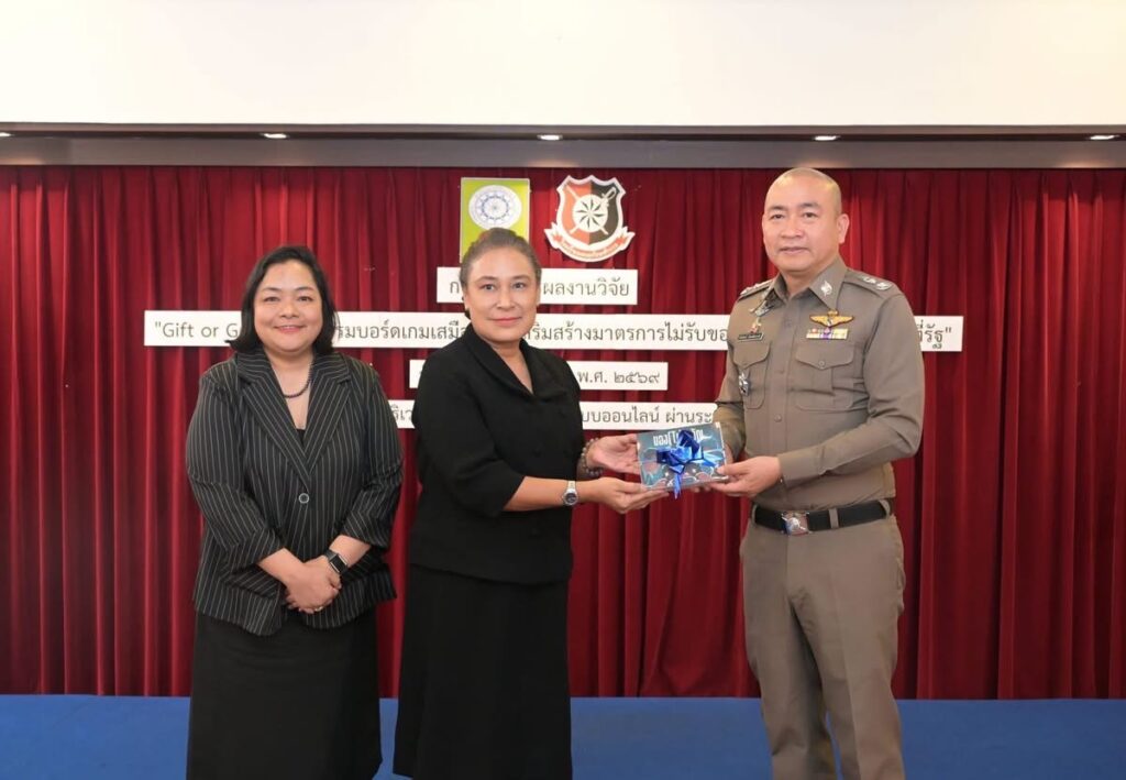 ต่อมา เป็นการนำเสนอผลการวิจัยโครงการ “การออกแบบและพัฒนาแพลตฟอร์มบอร์ดเกมเสมือนเพื่อสร้างองค์ความรู้และจัดทำมาตรการไม่รับของขวัญและของกำนัลในการปฏิบัติหน้าที่ของเจ้าหน้าที่รัฐ” โดย นายณัฐปกรณ์ ประเสริฐสุข เจ้าพนักงานป้องกันการทุจริตชำนาญการ สำนักงาน ป.ป.ช. และการแนะนำและร่วมกิจกรรมบอร์ดเกม “Gift or Guilt” และหลักสูตรออนไลน์ “No Gift Policy MOOC: แนวทางปฏิบัติและการขับเคลื่อนองค์กรโปร่งใส” โดย พันตำรวจโท วิชิต อาษากิจ โรงเรียนนายร้อยตำรวจ หัวหน้าโครงการ พร้อมด้วยการเสวนาในหัวข้อ “การบูรณาการงานวิจัยสู่การปฏิบัติ: ขับเคลื่อนมาตรการไม่รับของขวัญผ่านนวัตกรรมเกม” โดยได้รับเกียรติจากนายอุเทน กอวงษ์ สำนักงาน ป.ป.ช.,ผศ.(พิเศษ) ว่าที่ร้อยโท ดร.เจนรบ พละเดช ผู้ตรวจสอบทางวิชาการ, นายกิตติเดช ฉันทังกูล Hand Social Enterprise สร้างธรรมาภิบาลและความโปร่งใส และนายมูฮัมหมัดกัยฟาน สาและ สภาเด็กและเยาวชนแห่งประเทศไทยร่วมแลกเปลี่ยนองค์ความรู้และประสบการณ์ในการขับเคลื่อนนโยบาย No Gift Policy เพื่อเสริมสร้างธรรมาภิบาลและความโปร่งใสในภาครัฐ