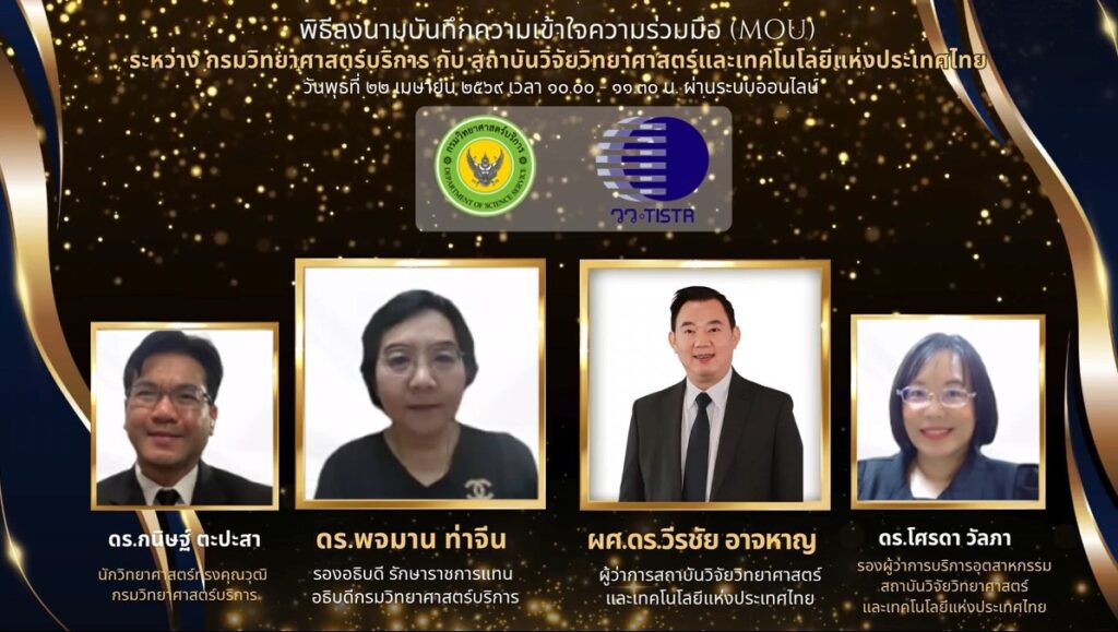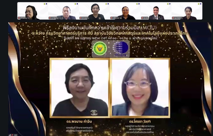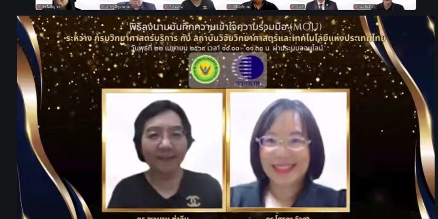 วันที่ 22 เมษายน 2569 กรมวิทยาศาสตร์บริการ (วศ.) กระทรวงการอุดมศึกษา วิทยาศาสตร์ วิจัยและนวัตกรรม (อว.) จัดพิธีลงนามบันทึกความเข้าใจ (MOU) ร่วมกับ สถาบันวิจัยวิทยาศาสตร์และเทคโนโลยีแห่งประเทศไทย (วว.) โดยมี ดร.พจมาน ท่าจีน รองอธิบดี รักษาราชการแทน อธิบดีกรมวิทยาศาสตร์บริการ และ ดร.โศรดา วัลภา รองผู้ว่าการบริการอุตสาหกรรม ผู้แทน ผู้ว่าการสถาบันวิจัยวิทยาศาสตร์และเทคโนโลยีแห่งประเทศไทย ร่วมลงนาม พร้อมด้วยคณะผู้บริหาร บุคลากรจากทั้งสองฝ่ายร่วมเป็นสักขีพยาน ผ่านระบบออนไลน์ (Zoom) วัตถุประสงค์เพื่อยกระดับการให้บริการทดสอบและสอบเทียบของประเทศให้มีคุณภาพและได้มาตรฐานสากล เป้าหมายสำคัญภายใต้กรอบความร่วมมือดังกล่าว ทั้ง (วศ.) และ (วว.) มุ่งสนับสนุนและส่งเสริมการให้บริการทดสอบและสอบเทียบให้สามารถตอบสนองความต้องการของภาคอุตสาหกรรม วิสาหกิจชุมชน และชุมชนได้อย่างมีประสิทธิภาพ ภายใต้มาตรฐานที่เป็นที่ยอมรับทั้งในระดับประเทศและระดับสากล พร้อมทั้งส่งเสริมการถ่ายโอนภารกิจในขอบข่ายที่หน่วยงานมีศักยภาพ ตลอดจนร่วมกันกำหนดทิศทางและวางแผนพัฒนาขีดความสามารถของห้องปฏิบัติการวิทยาศาสตร์ของประเทศ
