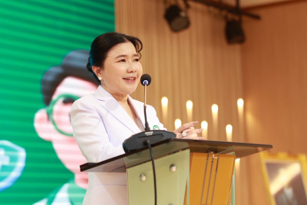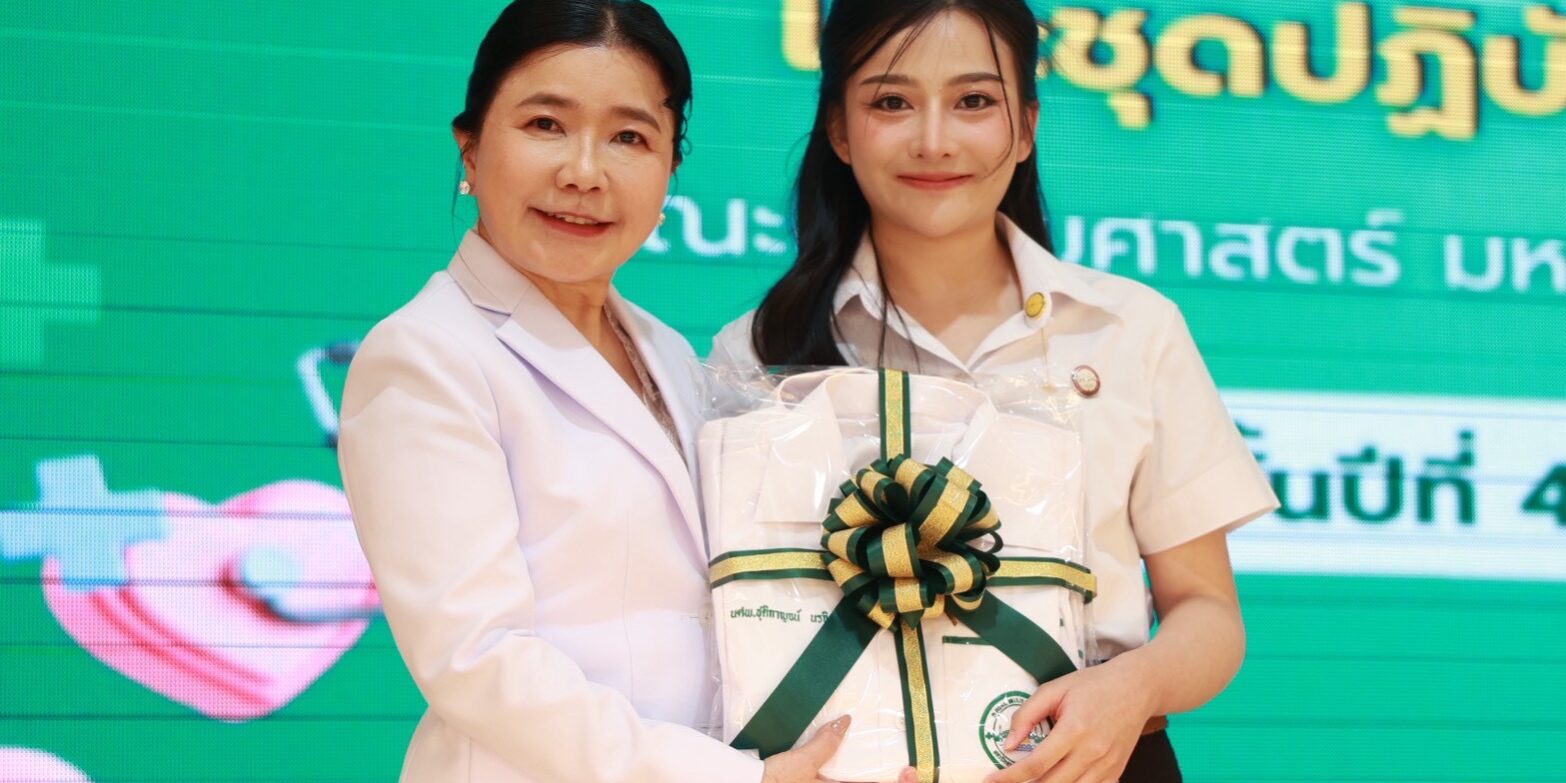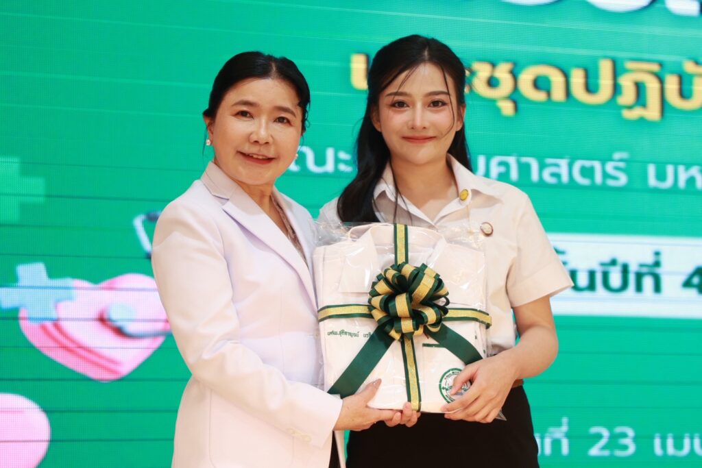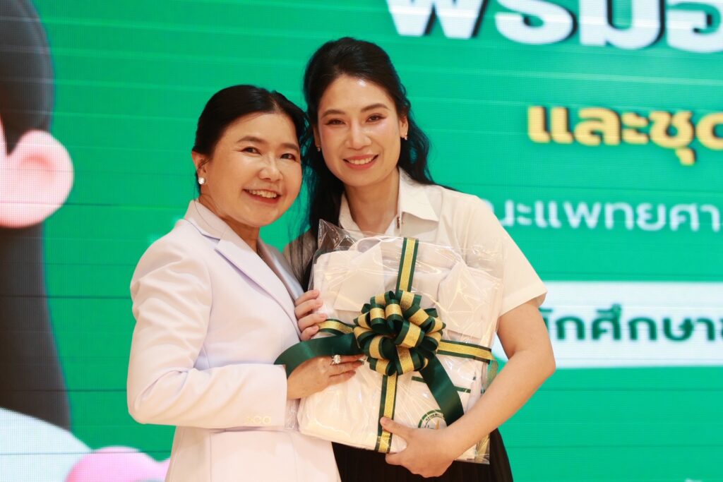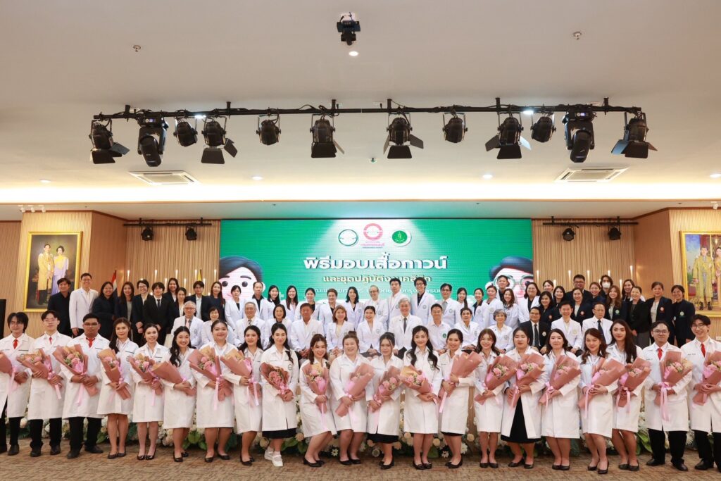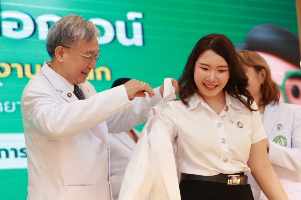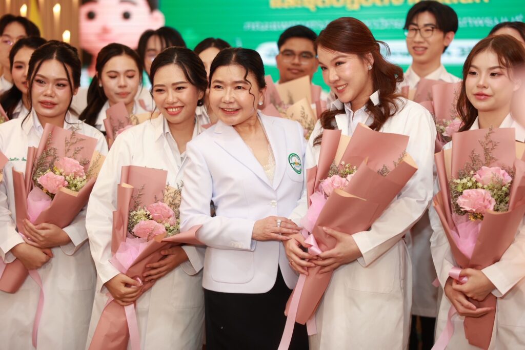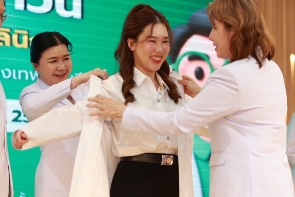 ผู้ช่วยศาสตราจารย์ ดร.ณัฐวรรณ สาสิงห์ ผู้ช่วยอธิการบดี มหาวิทยาลัยกรุงเทพธนบุรี ร่วมสวมเสื้อกาวน์ และมอบช่อดอกไม้ให้กับนักศึกษาแพทย์ในพิธีดังกล่าวด้วย