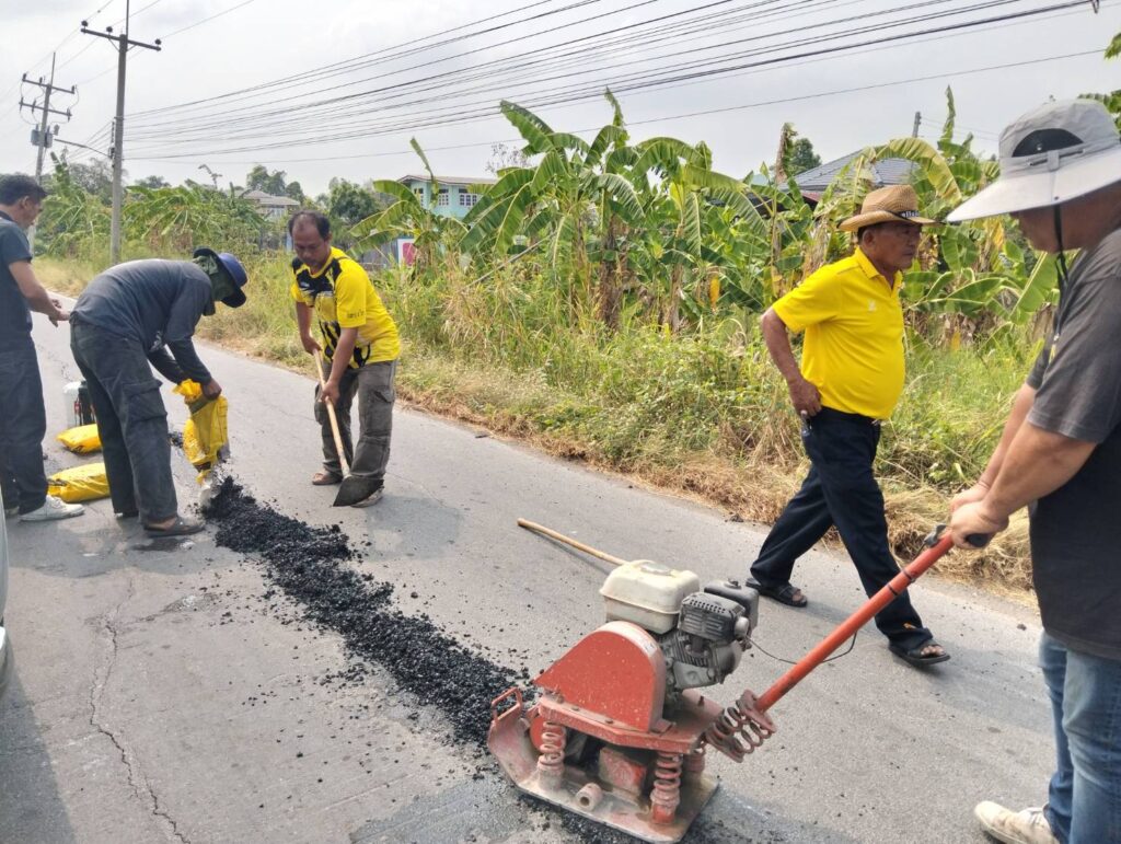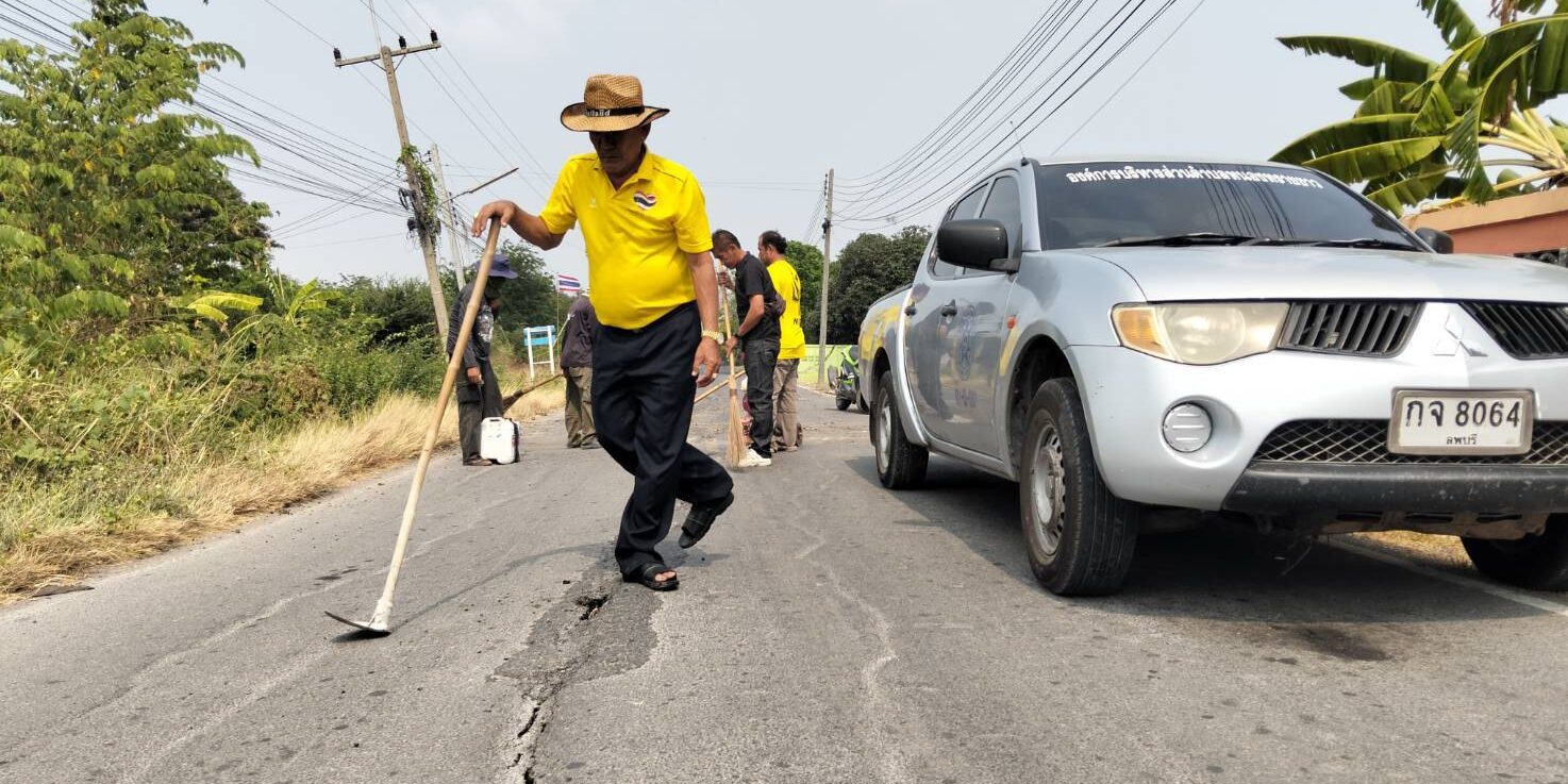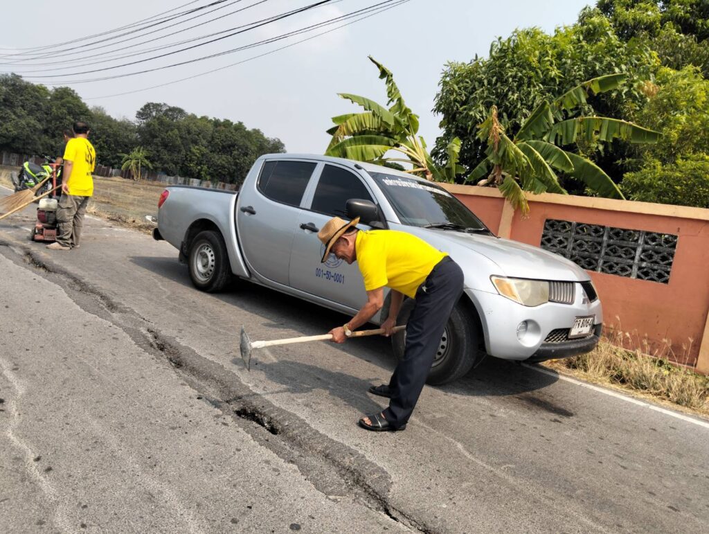 นายกองค์การบริหารส่วนตำบลหนองทรายขาว อำเภอบ้านหมี่ จังหวัดลพบุรี ใช้แรงกายแรงใจเหงื่อทุกเม็ด ทุกหยด ใช้มือทั้งสองข้างจับด้ามจอบให้มั่นคงซ่อมแซมถนนหน้าโรงเรียน ให้กับเด็กนักเรียนคณะครูประชาชนปลอดภัย หวั่นเกิดอุบัติเหตุบนท้องถนนจึงมาซ่อมแซมให้สมบูรณ์ และลาดยางกะตอยให้สมบูรณ์สวยงาม วันพุธที่ 22 เมษายน พ.ศ. 2569 เวลา 09.30 น.พันตำรวจเอก(พิเศษ) ธนศักดิ์ ปานแย้ม นายกองค์การบริหารส่วนตำบลหนองทรายขาว อำเภอบ้านหมี่ จังหวัดลพบุรี ได้พาทีมงานกองช่าง อบต.หนองทรายขาว ลงพื้นที่ซ่อมแซมถนนลาดยาง ตั้งแต่หน้าโรงเรียนบ้านสระเตยถึงซุ้มประตูวัดสระเตยใหญ่ “ที่เป็นหลุม ที่มีรอยแตกร้าวยาว มีขนาดกว้าง” ได้ทำการซ่อมแซมเสร็จแล้วเป็นบางส่วน เพื่อป้องการเกิดอุบัติเหตุการใช้รถจักรยานยนต์ และความปลอดภัยของผู้ใช้ถนนเส้นทางนี้