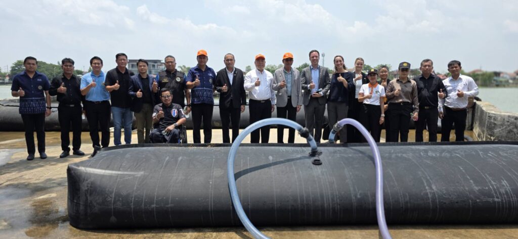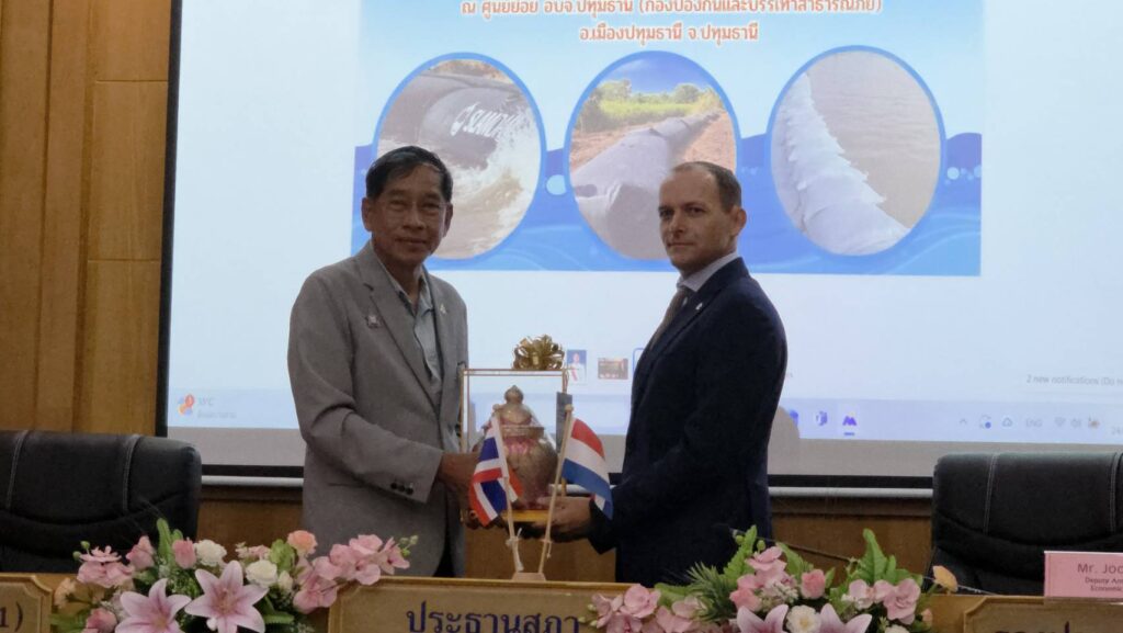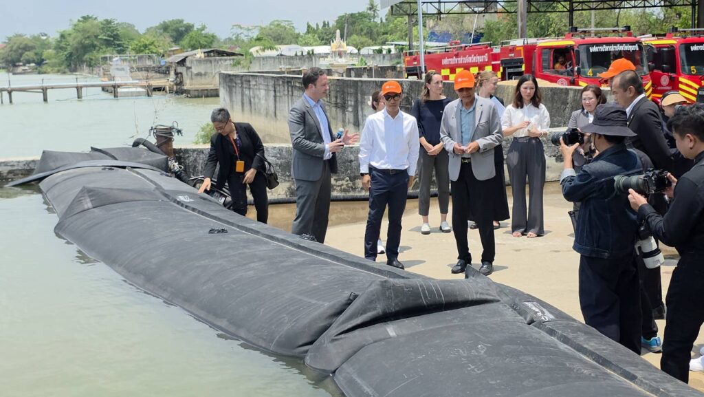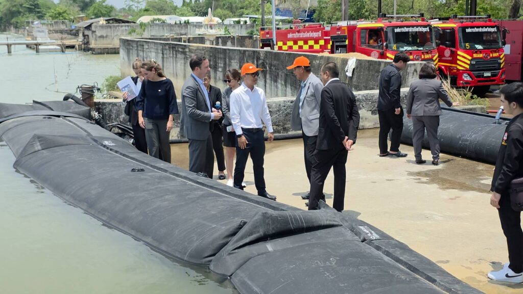 ส.อบจ.ปทุมธานี ผู้แทนภาคเอกชน พร้อมด้วยคณะอาจารย์จาก มหาวิทยาลัยเทคโนโลยีราชมงคลธัญบุรี เข้าร่วมรับฟังเพื่อเตรียมนำไปปรับใช้ในแผนบรรเทาสาธารณภัยไฮไลท์สำคัญคือการบรรยายสรุปโดย นายโอมาร์ ชาเล่ห์ (Mr. Omar Saleh) จากบริษัท WaveSave ผู้เชี่ยวชาญด้านนวัตกรรมน้ำจากเนเธอร์แลนด์ ได้อธิบายถึงระบบ “SLAMDAM” ซึ่งเป็นเขื่อนลมเคลื่อนที่ที่ออกแบบมาเพื่อความคล่องตัวสูง โดยผลิตภัณฑ์มี 2 ขนาดหลัก คือ ขนาดเล็ก ป้องกันน้ำได้สูง 80 เซนติเมตร ขนาดใหญ่ ป้องกันน้ำได้สูง 1.2 เมตร และทั้ง 2 ขนาดได้ทำการทดสอบคุณสมบัติความทนทานที่ อุณหภูมิ -30 องศา และ 120 องศา รับประกันการใช้งานและความทนทาน 40 ปี พร้อมคุณสมบัติพิเศษ มีความยาวรวม 5 เมตรต่อชุด และสามารถนำทั้งสองขนาดมาวางซ้อนทับกันเพื่อเพิ่มประสิทธิภาพในการกั้นน้ำตามความเหมาะสมของหน้างาน ในประเทศไทยได้ภายหลังเสร็จสิ้นการบรรยาย คณะผู้เข้าร่วมงานทั้งหมดได้ลงพื้นที่ไปยัง ศูนย์ย่อย อบจ.ปทุมธานี (กองป้องกันและบรรเทาสาธารณภัย) ต.บ้านกระแขง เพื่อชมการสาธิตการติดตั้งและใช้งานจริงของระบบเขื่อนลมเคลื่อนที่ SLAMDAM โดยมี นางสาวลูลู ซาต (Ms. Loulou Zaat) ที่ปรึกษาด้านนโยบายน้ำ และ นายฮันส์ ฟาน เดน บอร์น (Mr. Hans van den Born) ผู้อำนวยการบริหารหอการค้าเนเธอร์แลนด์-ไทย (NTCC) ร่วมสังเกตการณ์อย่างใกล้ชิด ในระหว่างการสาธิต เจ้าหน้าที่ได้แสดงให้เห็นถึง “ความเร็วและความง่ายในการติดตั้ง” ซึ่งเป็นหัวใจสำคัญของการรับมือน้ำท่วมฉับพลัน ระบบนี้ไม่ต้องใช้เครื่องจักรหนักหรือทรายจำนวนมหาศาล เพียงแค่ใช้การเติมน้ำเข้าไปในระบบเขื่อนลม ก็สามารถสร้างแนวกั้นน้ำที่มั่นคงได้ทันทีการทดสอบในสภาวะจำลองหน้างานแสดงให้เห็นว่า การวางต่อกันของเขื่อนสามารถทำได้อย่างแนบสนิท ช่วยยกระดับการป้องกันได้ ซึ่งทาง อบจ.ปทุมธานี และคณะผู้แทนเอกชนต่างให้ความสนใจในประสิทธิภาพความน่าเชื่อถือของนวัตกรรมนี้ เพื่อมุ่งเป้าลดความสูญเสียทางเศรษฐกิจและบรรเทาความเดือดร้อนของประชาชนชาวจังหวัดปทุมธานีอย่างยั่งยืนในอนาคต