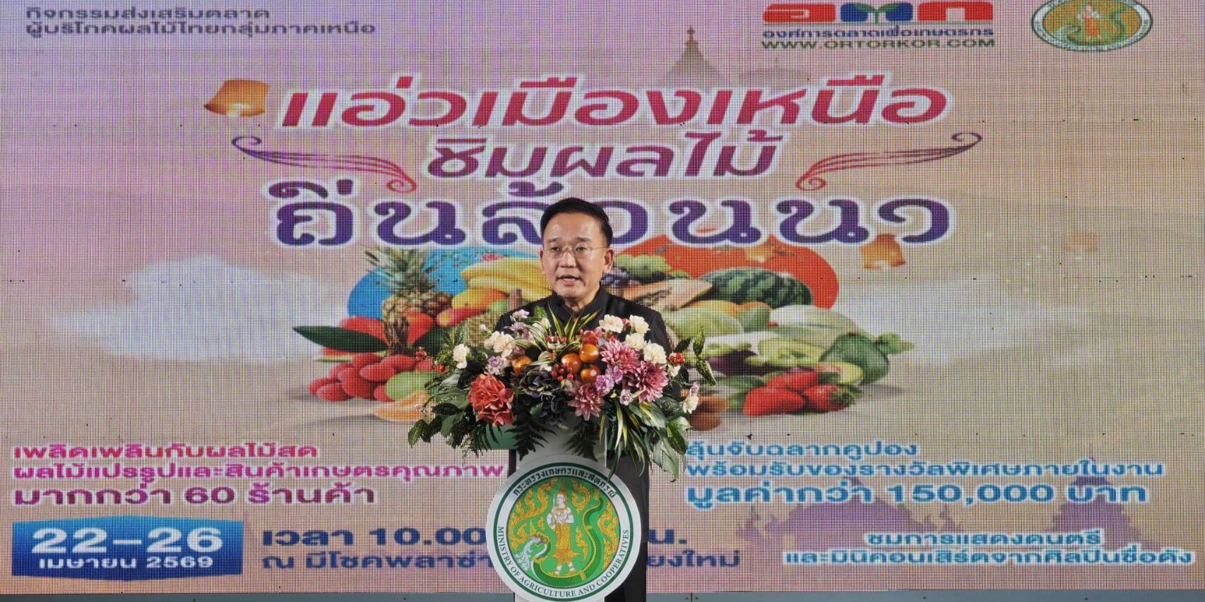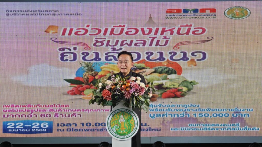 องค์การตลาดเพื่อเกษตรกร (อ.ต.ก.) ภายใต้การกำกับดูแลของกระทรวงเกษตรและสหกรณ์ จัดกิจกรรมส่งเสริมตลาดผู้บริโภคผลไม้ไทยกลุ่มภาคเหนือ ภายใต้ชื่องาน “แอ่วเมืองเหนือ ชิมผลไม้ถิ่นล้านนา” ระหว่างวันที่ 22–26 เมษายน 2569 ณ มีโชคพลาซ่า จังหวัดเชียงใหม่ และในวันที่ 23 เมษายน 2569 ได้จัดพิธีเปิดอย่างเป็นทางการ โดยได้รับเกียรติจาก ดร.พรเทพ ศรีธนาธร ผู้ตรวจราชการกระทรวงเกษตรและสหกรณ์ เป็นประธานในพิธีเปิดงาน พร้อมด้วยผู้บริหารระดับสูงจากหน่วยงานภาครัฐ ภาคเอกชน สถาบันเกษตรกร และประชาชนเข้าร่วมงานอย่างคับคั่ง