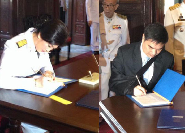 แล้ว ขณะที่ ยิ่งลักษณ์ และ อภิสิทธิ์ เข้าลงนามถวายพระพรด้วย