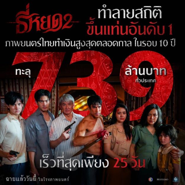 “ธี่หยด 2” ทำลายสถิติ ขึ้นแท่นอันดับ 1 ภาพยนตร์ไทยทำรายได้สูงสุดในรอบ 10 ปี! ทะลุ 739 ล้านบาท เร็วที่สุดเพียง 25 วัน!