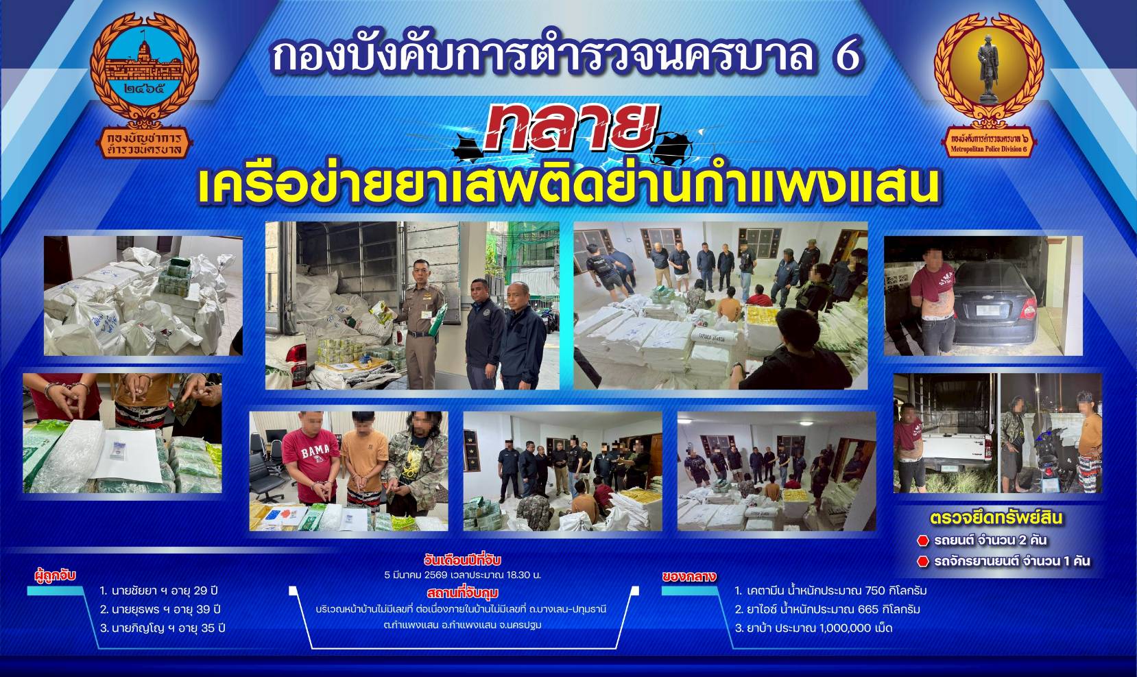 สืบสวนนครบาล 6 ทลายแหล่งพักยารายใหญ่ ย่านกำแพงแสน ได้ยาเสพติดกว่า 1.4 ตัน และ ยาบ้า 1 ล้านเม็ด