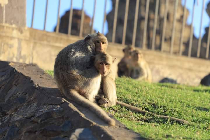 ฝูงลิงลพบุรีหลายร้อยตัวพากันออกมานั่ง และนอนอาบแดดกอดเกาะกลุ่ม เพื่อรับไออุ่นจากแสงแดดหน้าพระปรางค์สามยอด หลังจากที่จังหวัดลพบุรีมีสภาพอากาศที่หนาวเย็นต่อเนื่อง