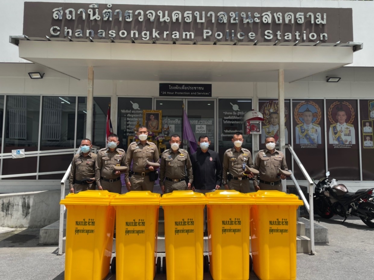 พล.ต.ท.ปิยะ ต๊ะวิชัย ผบช.ภ.5 เป็นตัวแทนนำถังขยะมามอบให้กับ สน.ชนะสงคราม