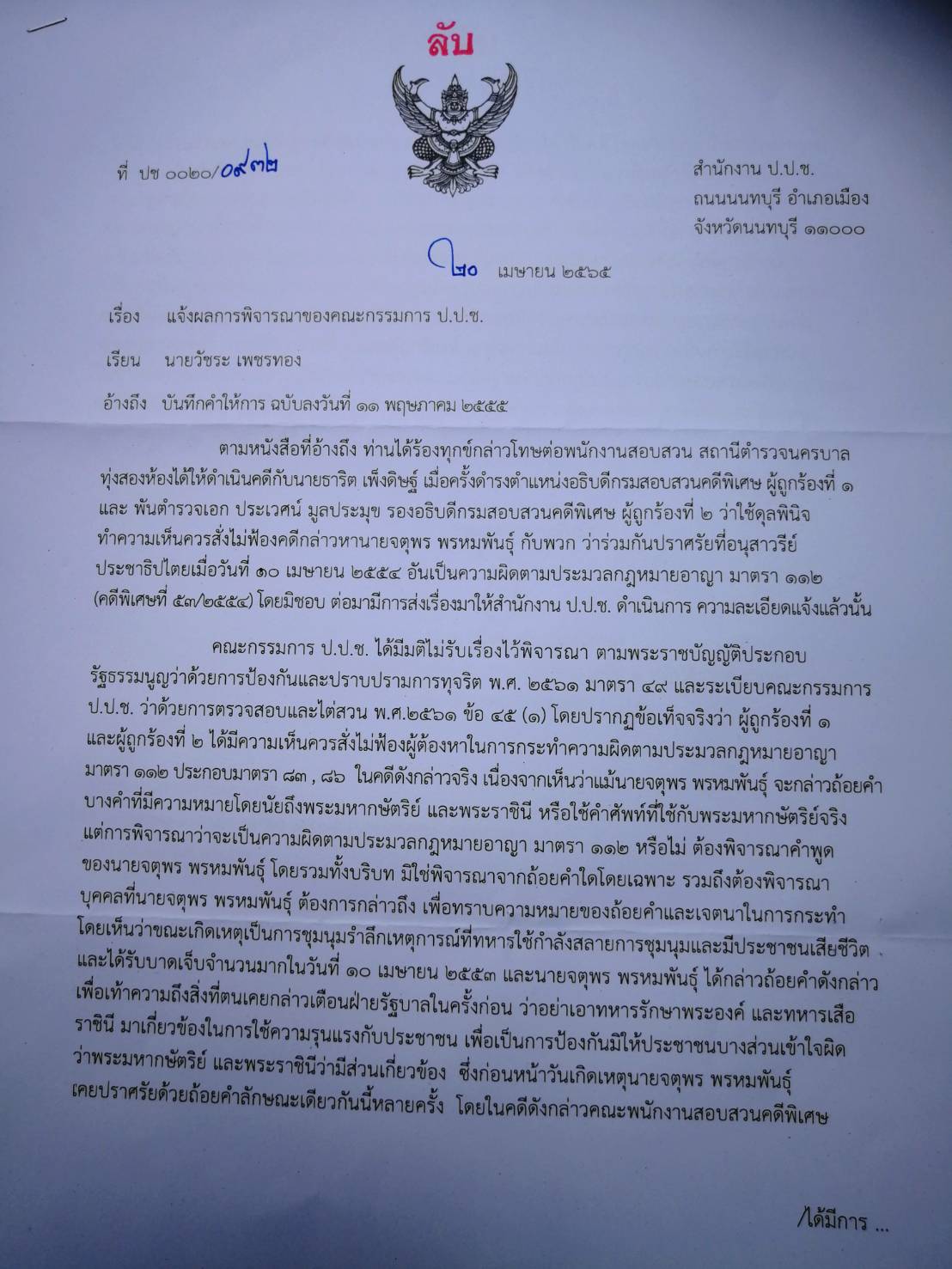 ต้องใช้เวลา 11 ปี ป.ป.ช.ถึงมีคำตอบ!!ธาริต-ประเวศน์ไม่ผิดสั่งไม่ฟ้องตู่จตุพรปราศรัยพาดพิงสถาบันปี 54