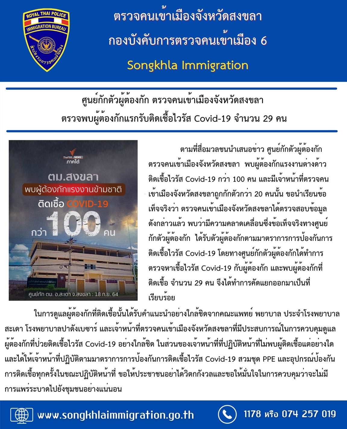 ตม.จ.สงขลา ชี้แจงกรณีปรากฏทางสื่อฯว่า ศูนย์กักตัวผู้ต้องกัก ตม.จ.สงขลา ตรวจพบผู้ต้องกักแรกรับติดเชื้อไวรัส Covid-19 จำนวน 29 คน