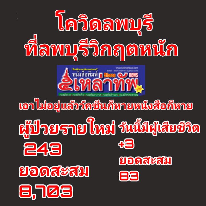 โควิดลพบุรี ที่ลพบุรีวิกฤตหนัก เอาไม่อยู่แล้ววัคซีนก็หายหนังสือก็หายทำให้มีผู้ติด โควิด วันนี้มีผู้เสียชีวิต 83ผู้ป่วยรายใหม่ 243 ยอดสะสม8,703