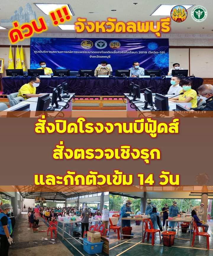 ผู้ว่าฯ ลพบุรี สั่งด่วนปิดโรงงานบีฟู้ด ตรวจพนักงานเชิงรุก กักตัวเข้ม 14 วัน
