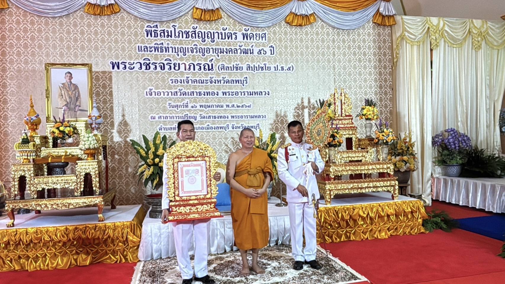 นายอำเภอเมืองลพบุรี “หัวใจเพชร”ร่วมพิธีสมโภชสัญญาบัตร พัดยศ และพิธีทำบุญเจริญอายุมงคลวัฒน์ ๕๖ ปี พระวชิรจริยาภรณ์ รองเจ้าคณะจังหวัดลพบุรี