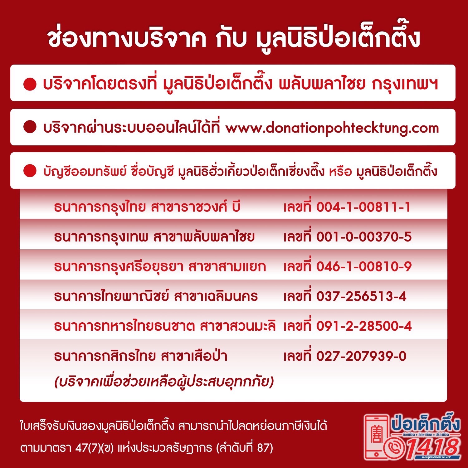 Detailsมูลนิธิป่อเต็กตึ๊งขอเชิญชวนผู้มีจิตศรัทธาร่วมเป็นสะพานบ…