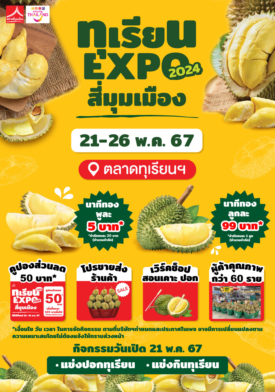 ปทุมธานี ตลาดสี่มุมเมืองชวนเที่ยวช็อปงานทุเรียนเอ็กซ์โป 21-26 พ.ค.นี้ โปรฯ นาทีทองทุเรียนพูละ 5 บาท และลูกละ 99 บาท