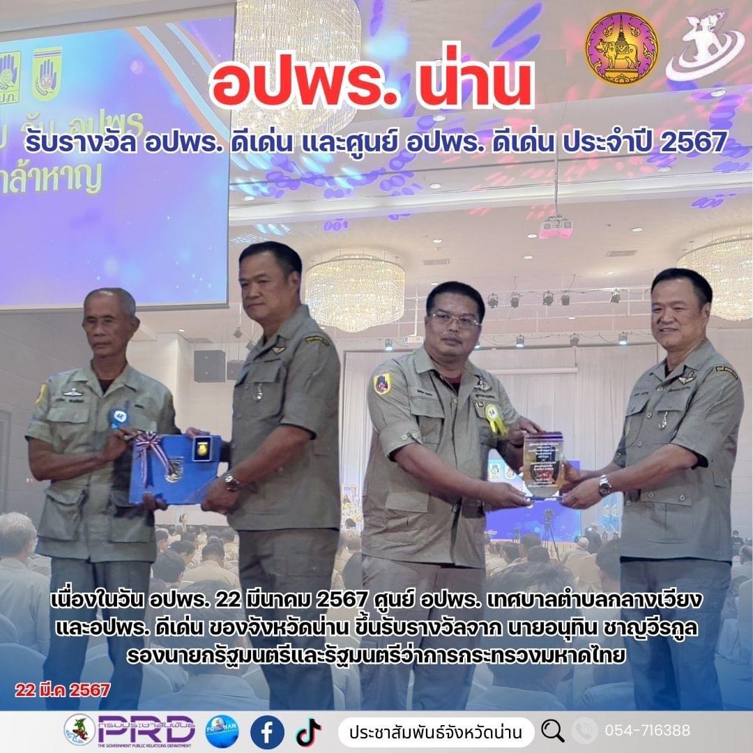 น่าน รับรางวัล ศูนย์ อปพร. ดีเด่น และอปพร. ดีเด่น ประจำปี 2567 จากรัฐมนตรีว่าการกระทรวงมหาดไทย