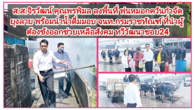 ส.ส.จิรวัฒน์ คุณพรพิมล ลงพื้นที่ พ่นหมอกควันกำจัดยุงลาย พร้อมนำน้ำดื่มมอบ จนท.กรมราชทัณฑ์ ที่นำผู้ต้องขังออกช่วยเหลือสังคม ทวีวัฒนาซอย24